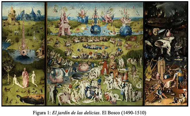 El jardín de las delicias es, probablemente, la obra más famosa del pintor flamenco Jheronimus Bosch, conocido en español como “El Bosco”. Se trata de una pintura al óleo sobre tabla, en formato tríptico, realizada entre 1490 y 1510. Sus dimensiones son de 220 cm x 389 cm. Se encuentra desde 1939 en el Museo del Prado de Madrid. En este cuadro El Bosco pintó criaturas híbridas, estructuras delirantes y escenas oníricas que no llegarían a entenderse hasta cuatro siglos después (Figura 1); por ello, se le considera un precursor del surrealismo. Estos elementos compositivos serían capitales para los artistas surrealistas, como Salvador Dalí, 400 años después.