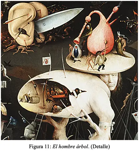 Para finalizar, comentaremos la imagen del hombre-árbol. Algunos expertos afirman que se trata de un autorretrato de El Bosco, mientras que otros piensan que es una representación del diablo, presente en todos los vicios; de hecho, el interior del hombre-árbol contiene una bodega con prostitutas y juegos de mesa (figura 11).