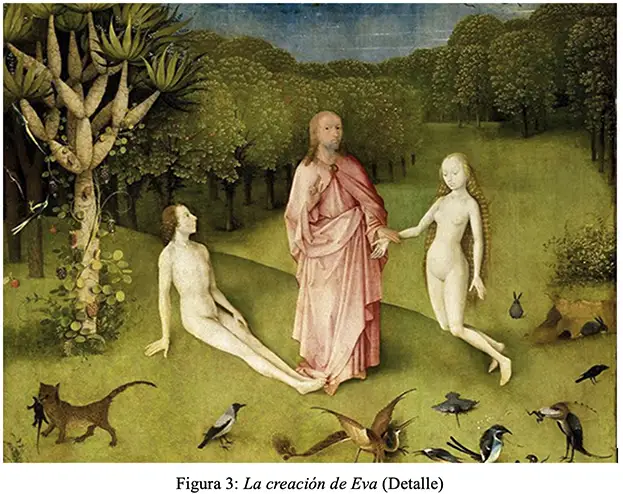 En la parte inferior aparece la creación de Eva. Dios (en la persona de Jesucristo) la sostiene de la mano para presentársela a Adán como compañera. Adán se está incorporando porque acaba de despertar de un profundo sueño inducido por Jehová para formar a Eva de una de sus costillas (Génesis 2:21-23). A la izquierda de Adán aparece un drago, símbolo de la vida, mientras que a la derecha de Eva podemos observar algunos animales, como conejos, sapos, culebras y otros seres fantásticos que simbolizan los vicios. Un gato lleva un ratón muerto en su boca, presagio de violencia y muerte en el Paraíso (figura 3).