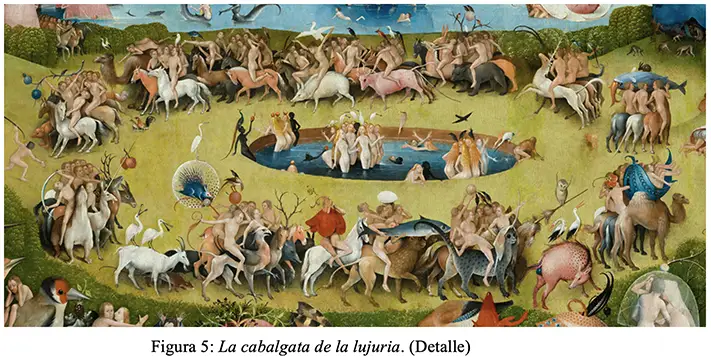Bajo la fuente podemos observar un gran círculo de jinetes (La cabalgata de la lujuria) que cabalgan sobre animales y monstruos, lo cual se ha interpretado como la humanidad arrastrada por los vicios (figura 5).