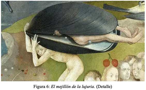 El mejillón de la lujuria (figura 6) representa la homosexualidad para algunos autores, mientras que otros lo interpretan como una alegoría del adulterio, siendo el esposo engañado el que carga con él.