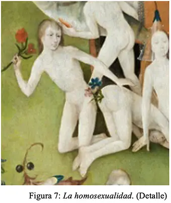 La homosexualidad es innegable en la figura de una pareja de hombres, uno de los cuales se encuentra en posición genu-pectoral y de cuyo ano sale una flor, mientras que el otro porta un ramillete de flores (figura 7).